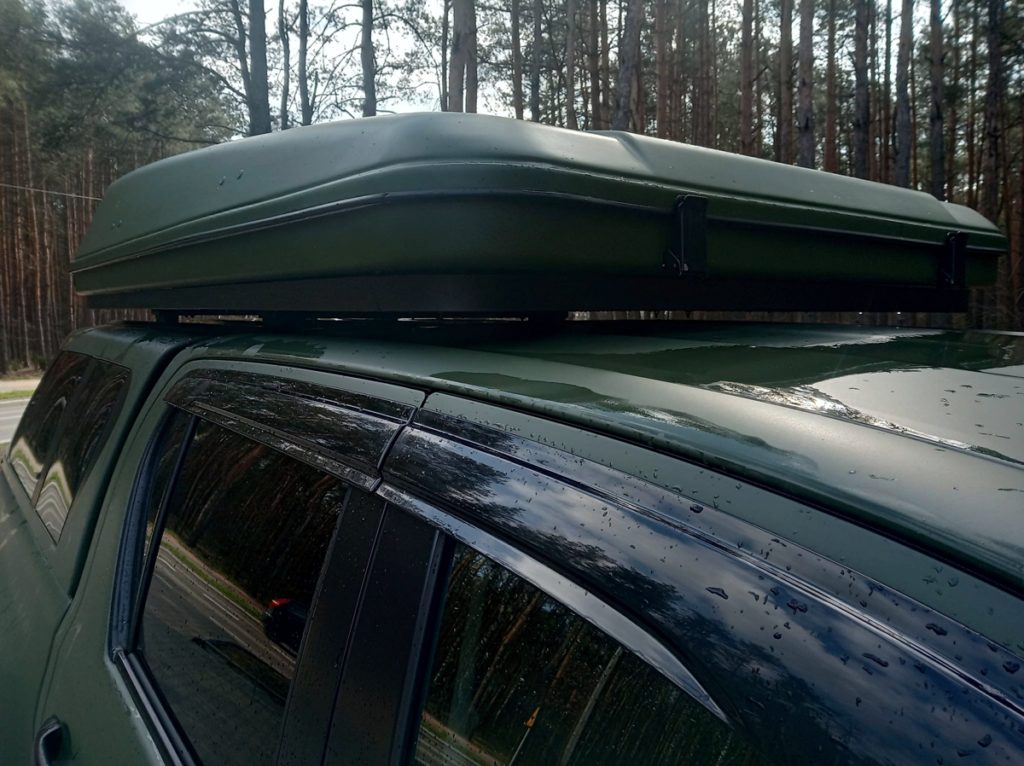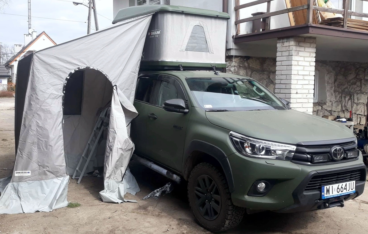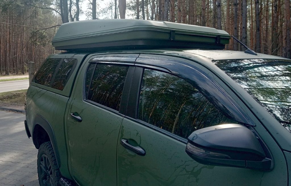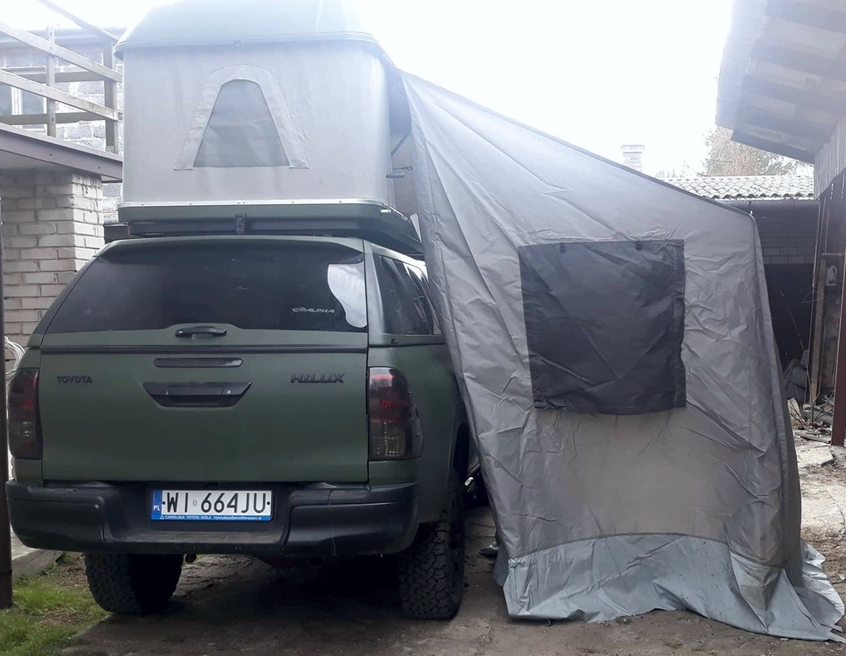 Klientowi zależało, aby auto z bagażnikiem i namiotem dachowym było możliwie najniższe. Z kolei długość „kapsuły” namiotu, wymagała jej montażu w tylnej części auta, nad „hard topem”, przykrywającym pakę.