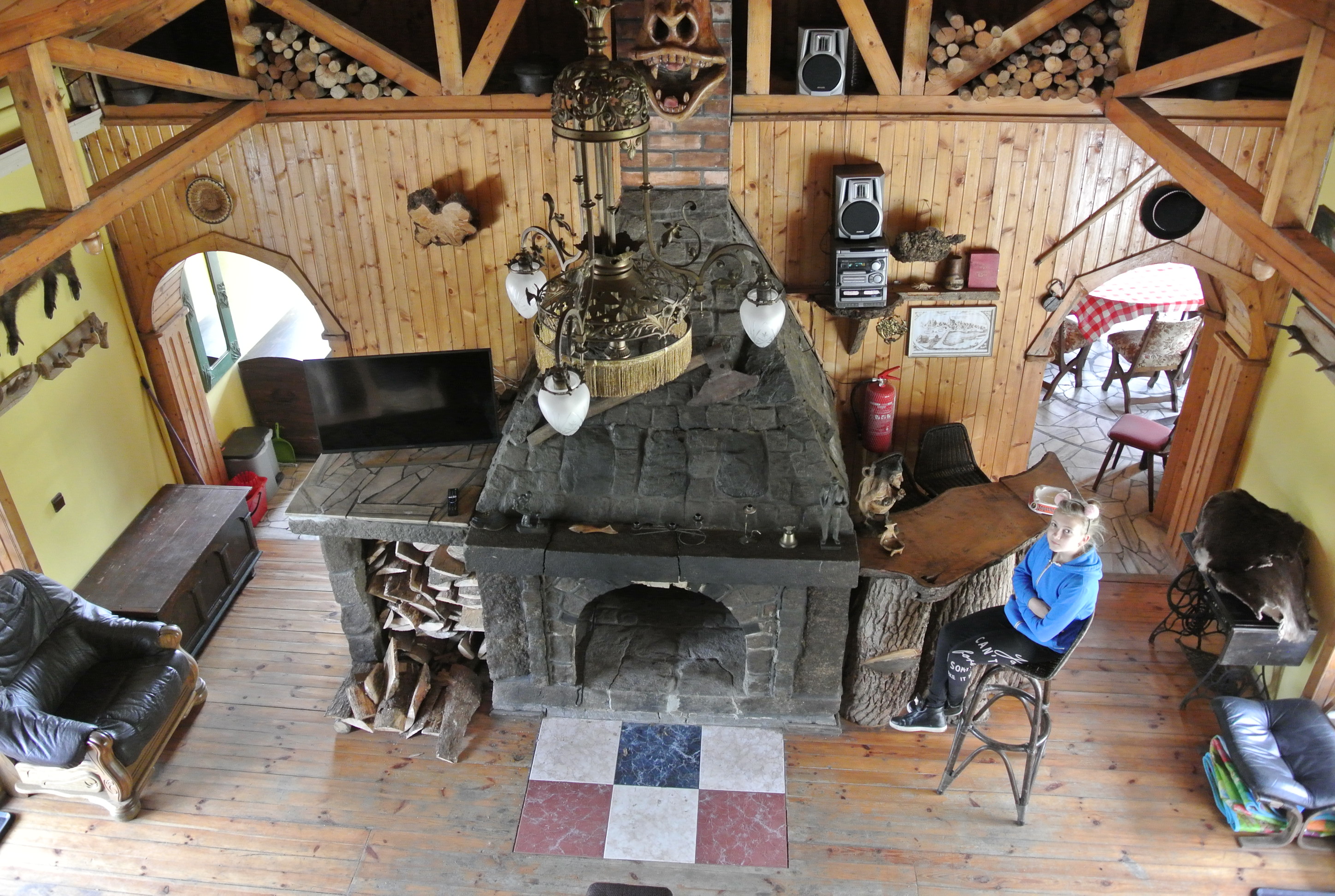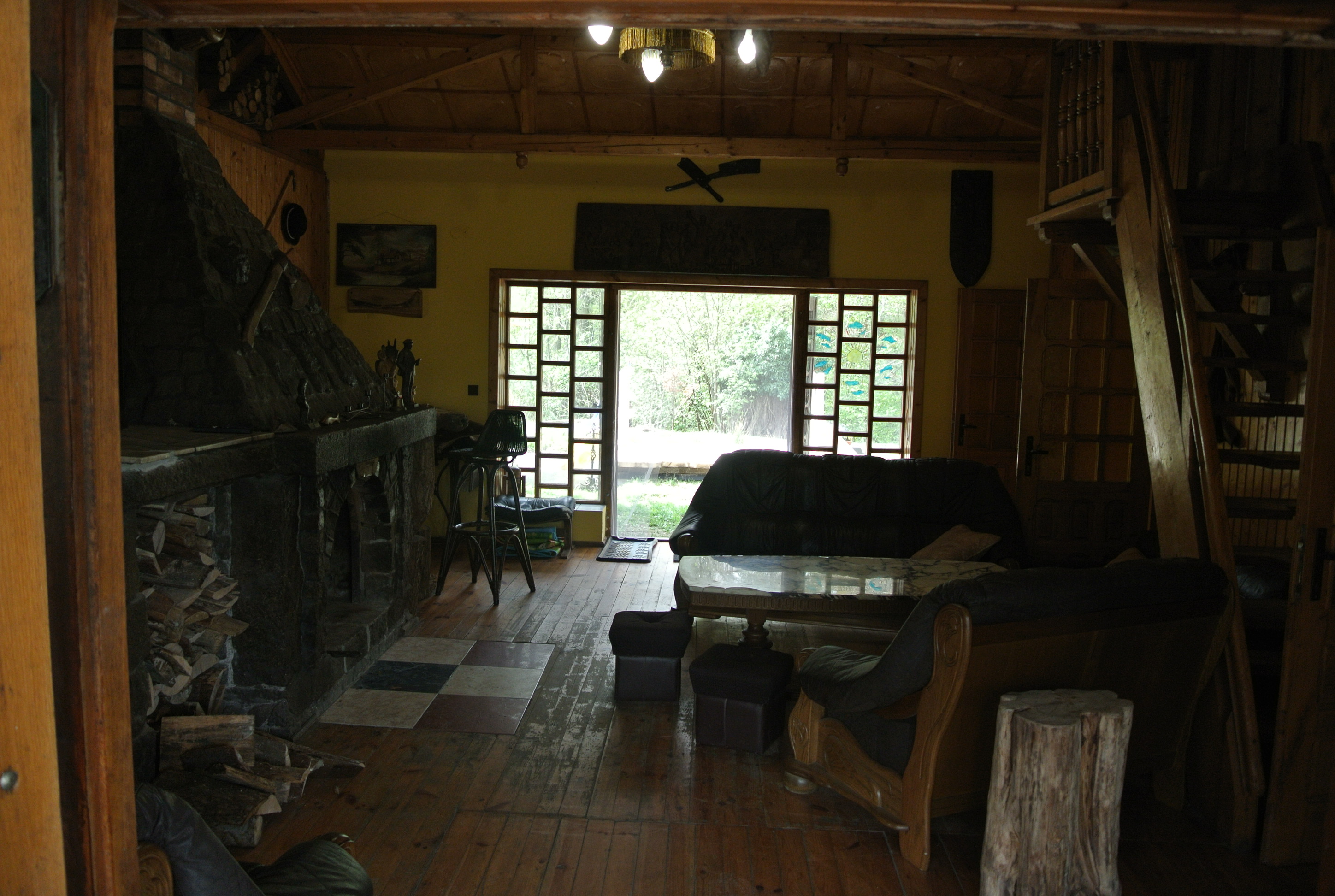 - salon z kominkiem (palenie w kominku zapewnia grzanie domku i wody użytkowej),