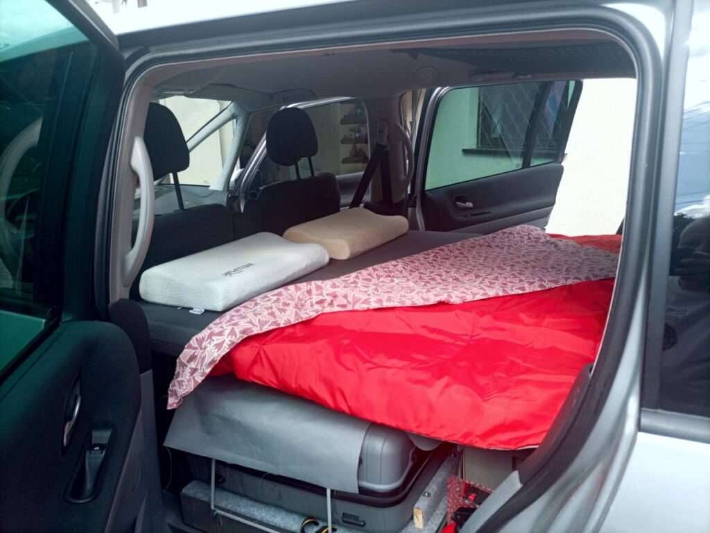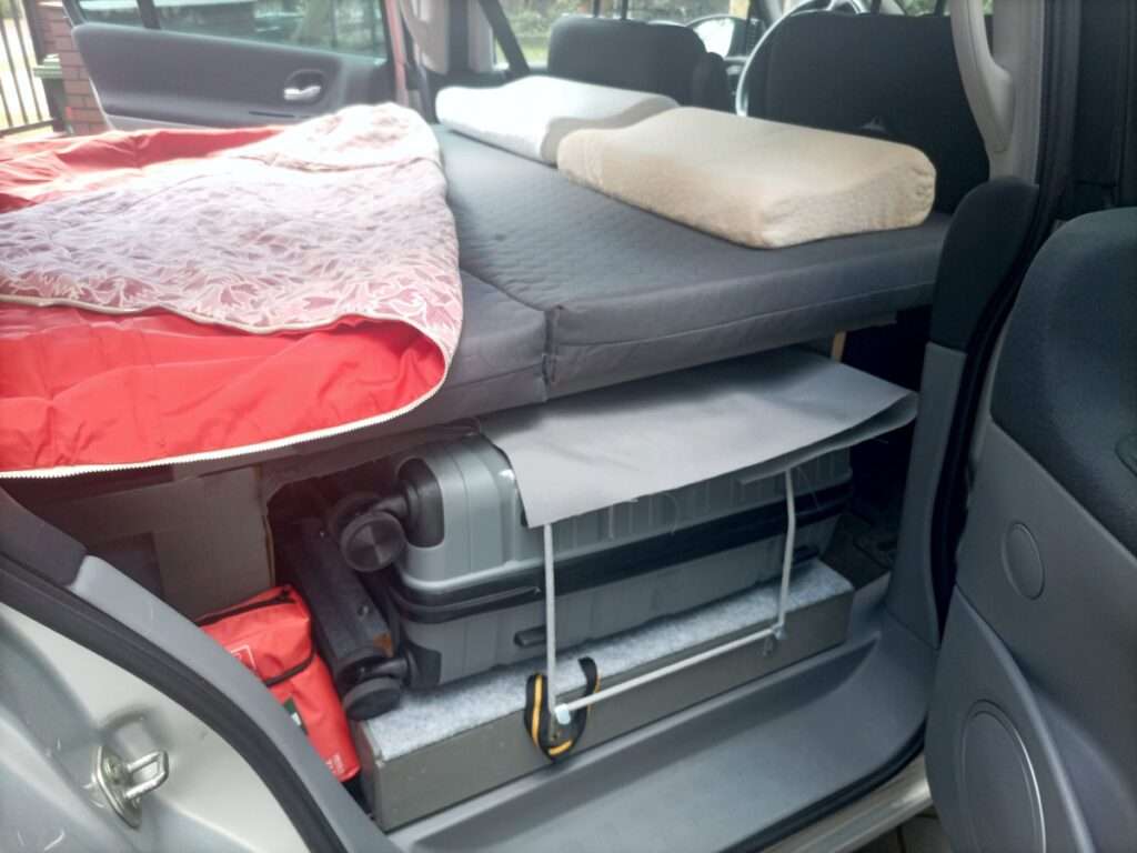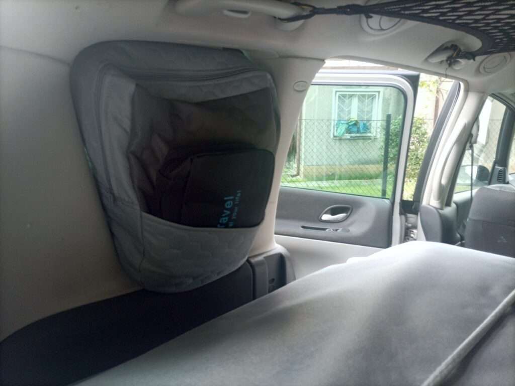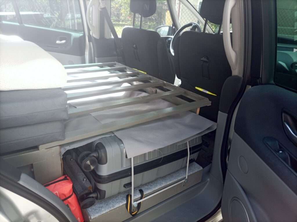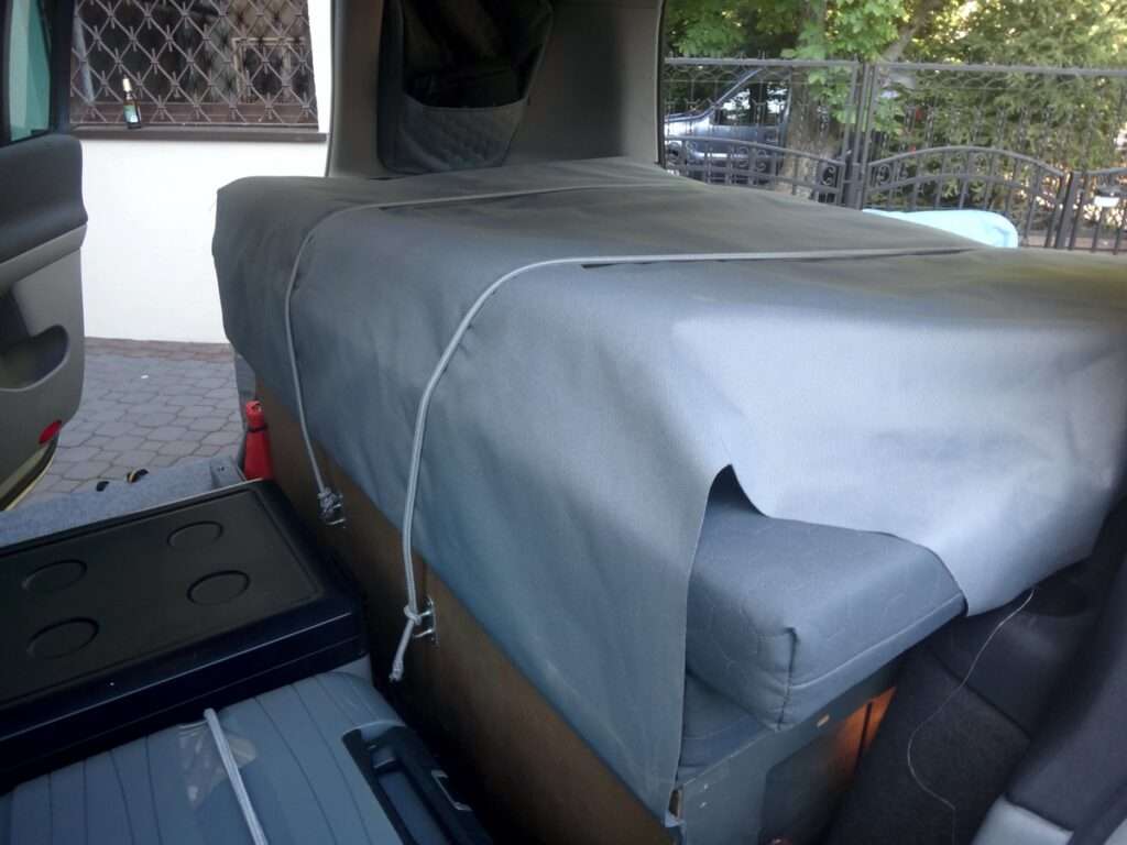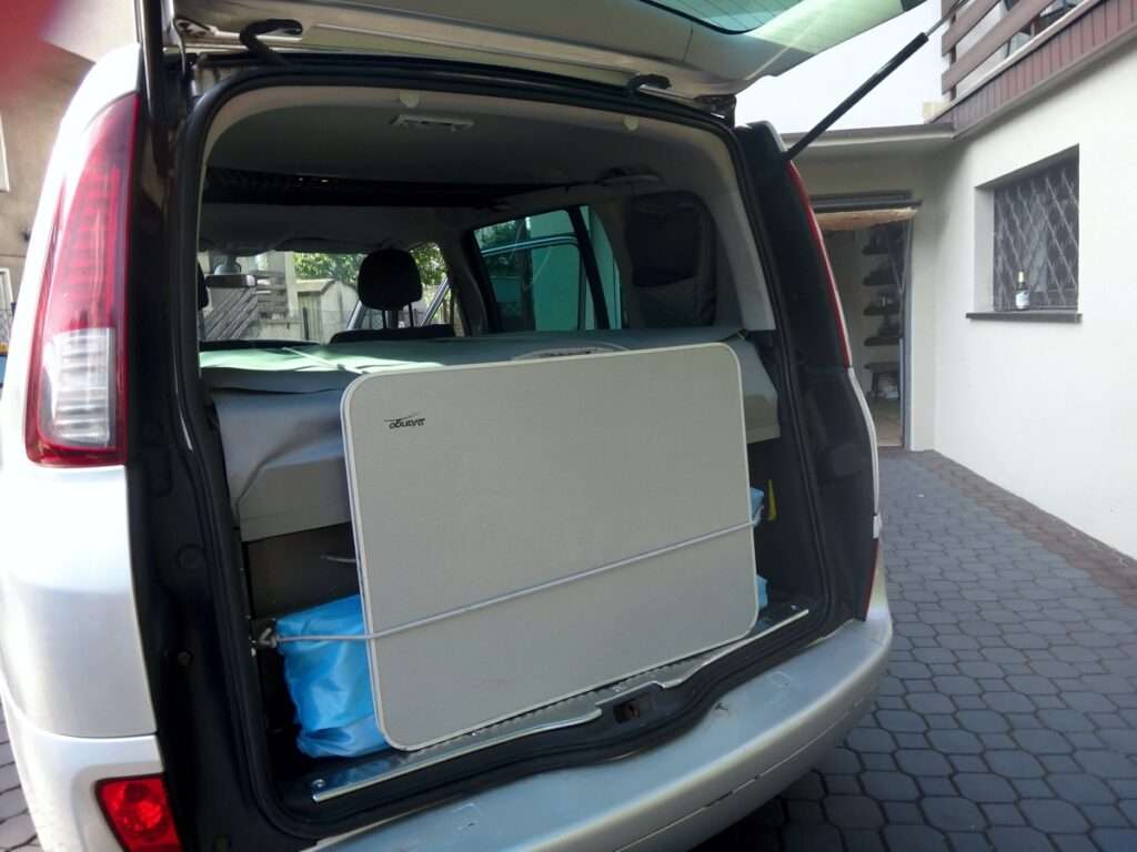 Po otwarciu klapy bagażnika od razu mamy dostęp do rozkładanego stolika turystycznego (pierwsze zdjęcie). Za nim znajdują się dwa krzesełka (niebieskie pokrowce). Przed ich wypadnięciem po otworzeniu klapy zabezpiecza guma. Stolik i krzesełka mają tu swoje miejsce także w czasie spania (nie przeszkadzają w korzystaniu z rozkładanego łóżka).