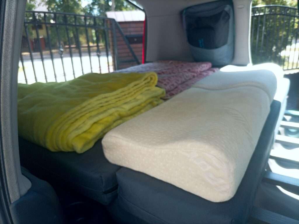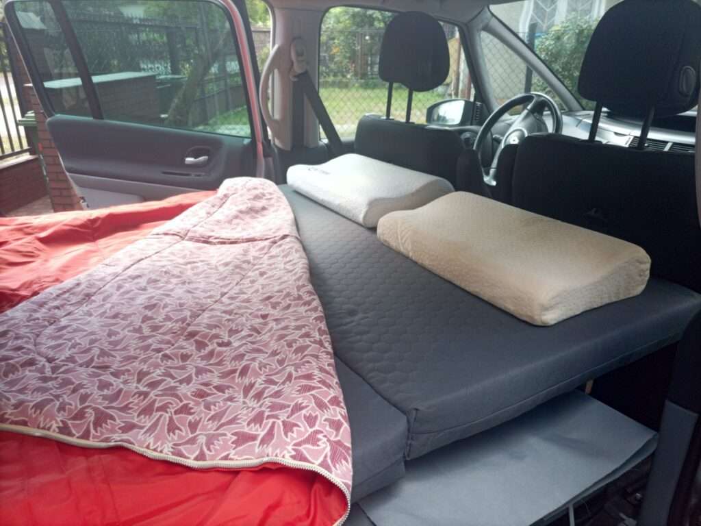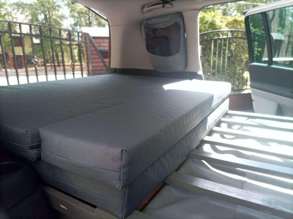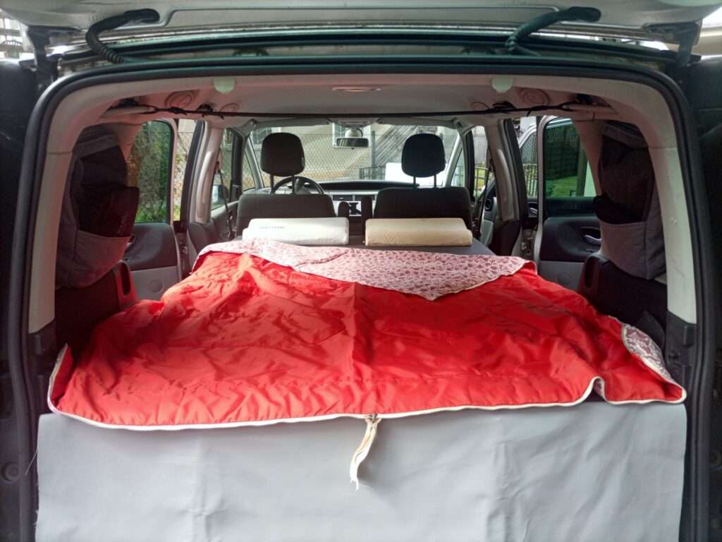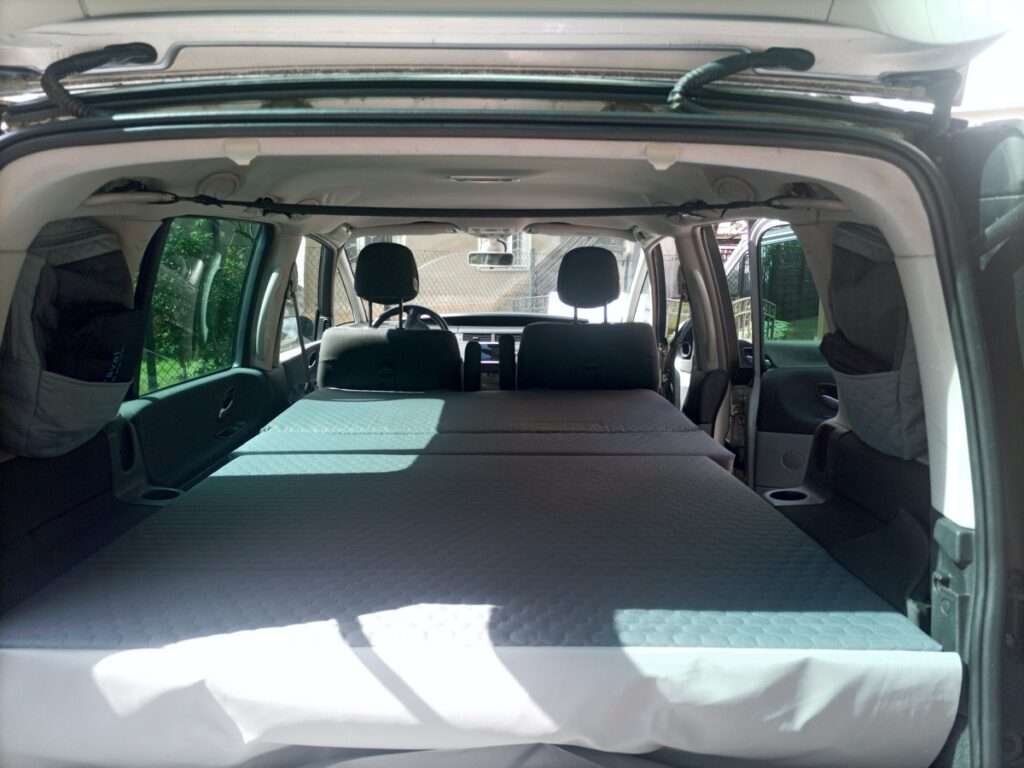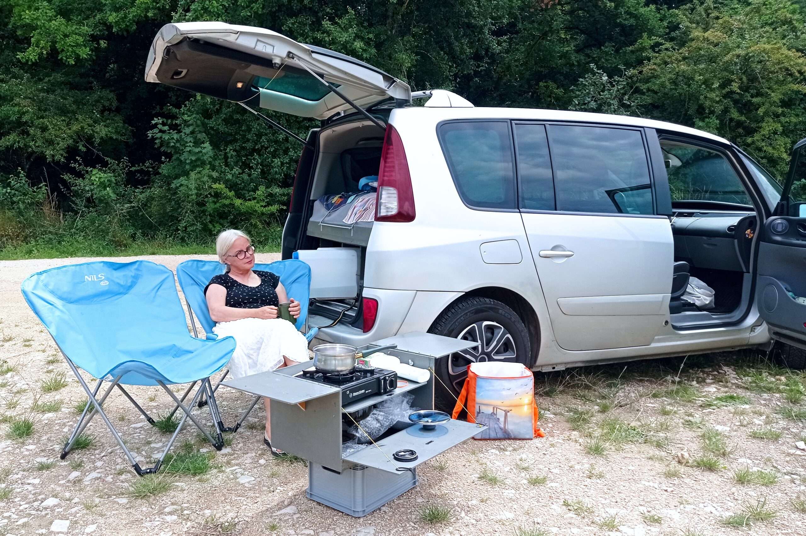 Po otwarciu klapy bagażnika od razu mamy dostęp do rozkładanego stolika turystycznego (pierwsze zdjęcie). Za nim znajdują się dwa krzesełka (niebieskie pokrowce). Przed ich wypadnięciem po otworzeniu klapy zabezpiecza guma. Stolik i krzesełka mają tu swoje miejsce także w czasie spania (nie przeszkadzają w korzystaniu z rozkładanego łóżka).