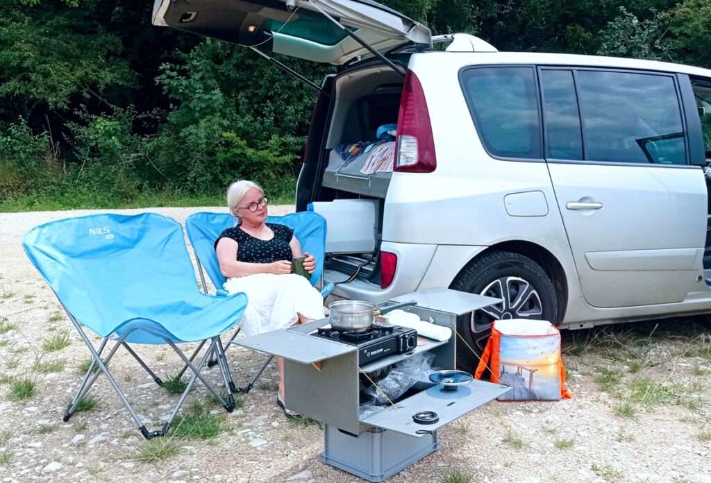 Ósme zdjęcie przedstawia kontenerową kuchnię w stanie złożonym, a ostatnie – już rozłożoną na biwaku. Taka kuchnia ma dużą przewagę nad tymi montowanymi w wysuwanych szufladach: można ją ustawić tam, gdzie chcesz – w cieniu, pod wiatą czy nawet na parkingowym stole czy ławce – i gotować bez konieczności stania przy samochodzie.