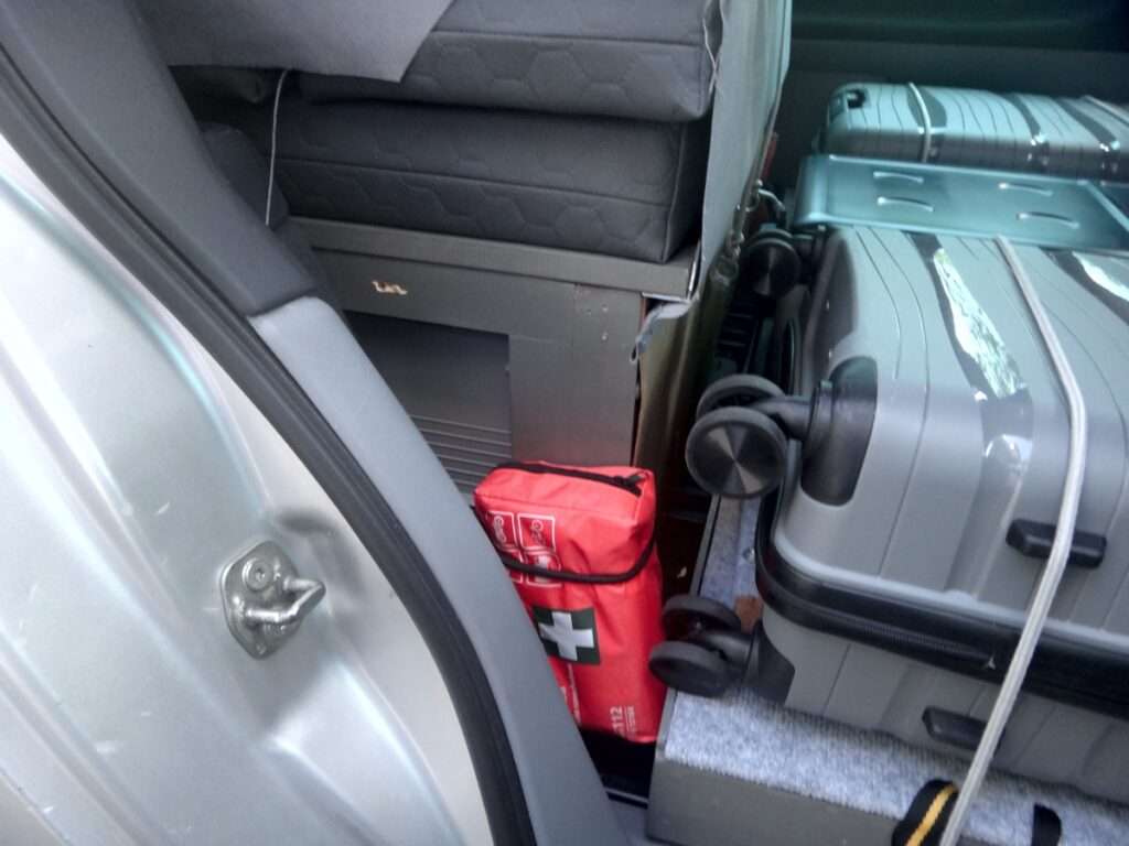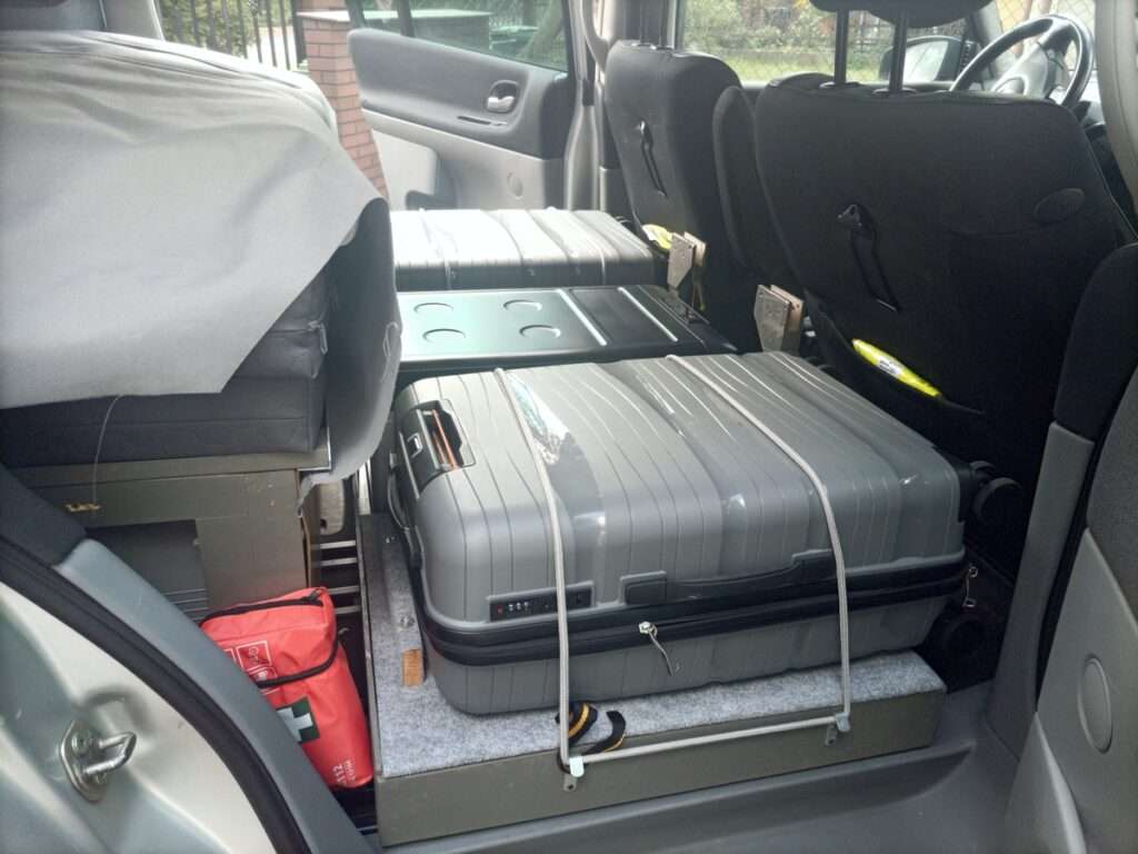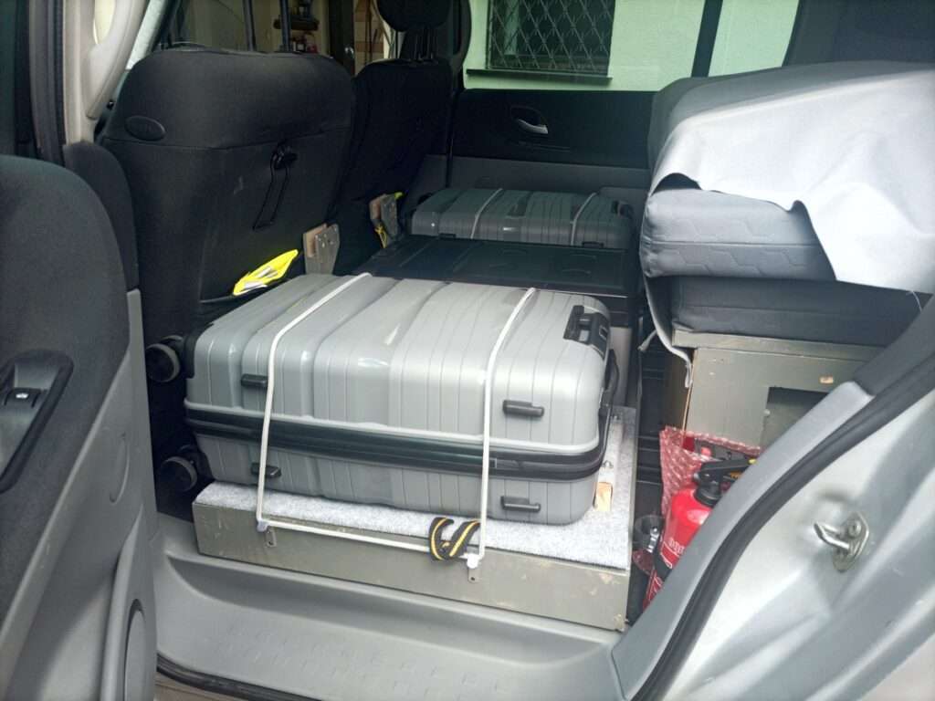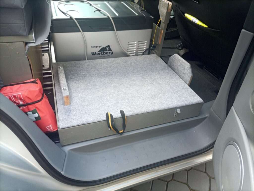 Zdjęcia pierwsze i drugie pokazują widok zabudowy podłogi po otwarciu prawych i lewych drzwi pasażera. W aucie zostawiłem tylko przednie fotele – to wersja przygotowana dla dwóch osób! W zabudowie mieszczą się dwie walizki, łatwe do otwarcia lub wyjęcia po odpięciu gum mocujących. Pomiędzy nimi znajduje się lodówka.