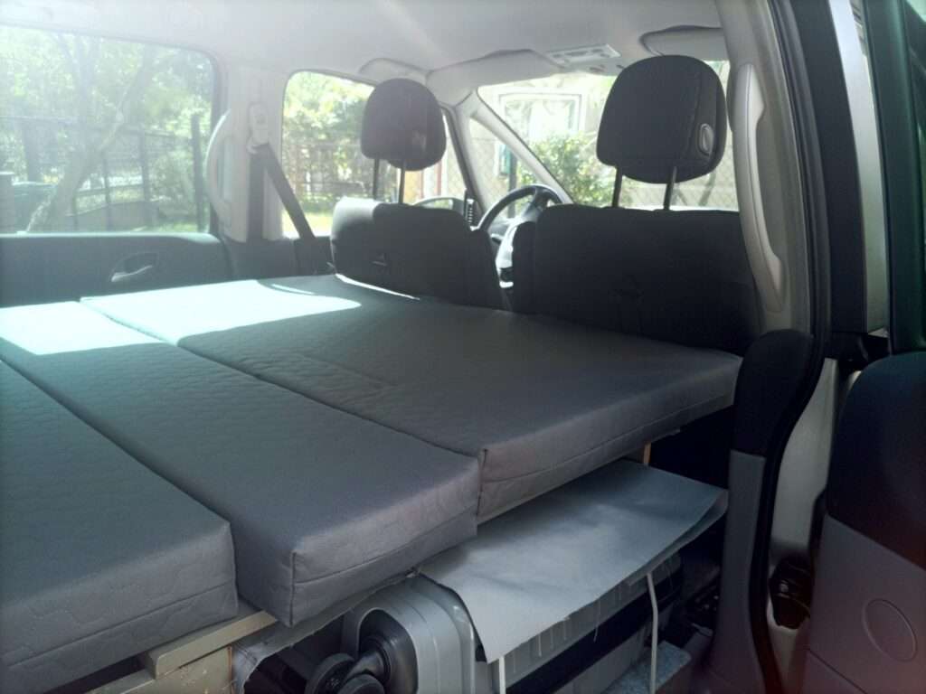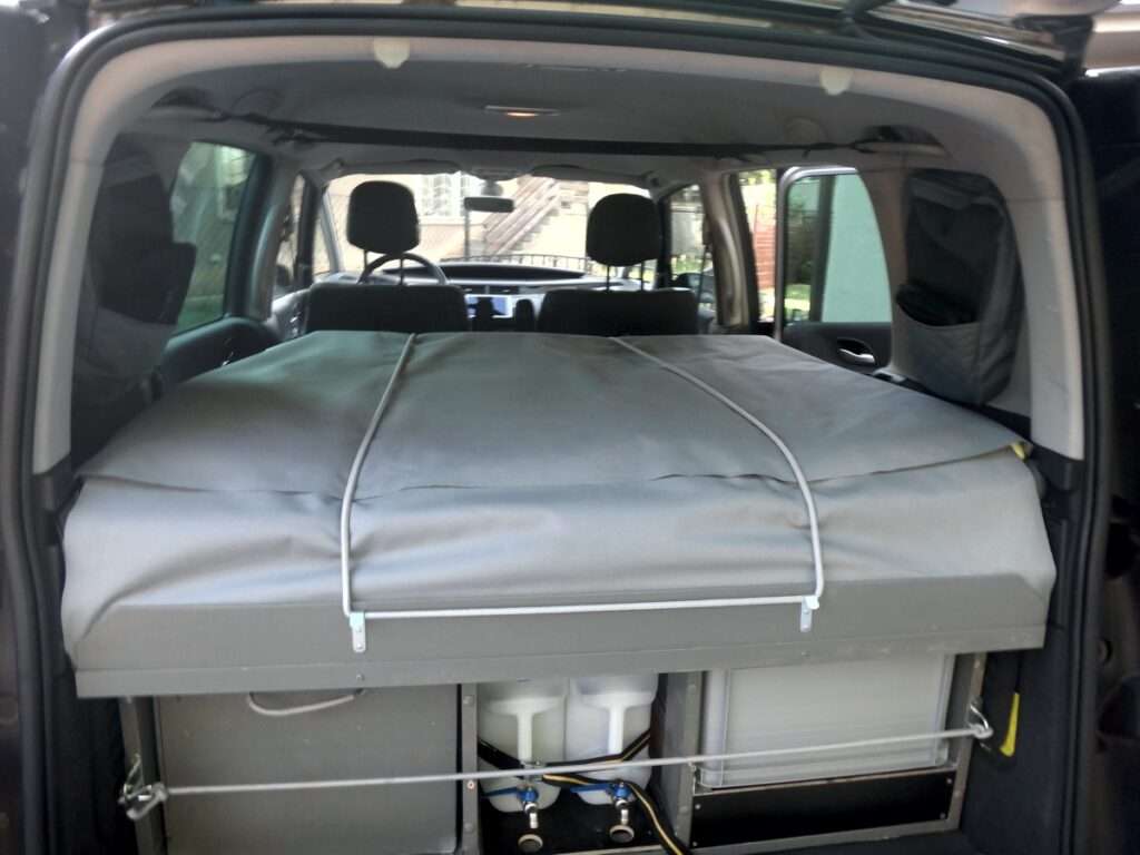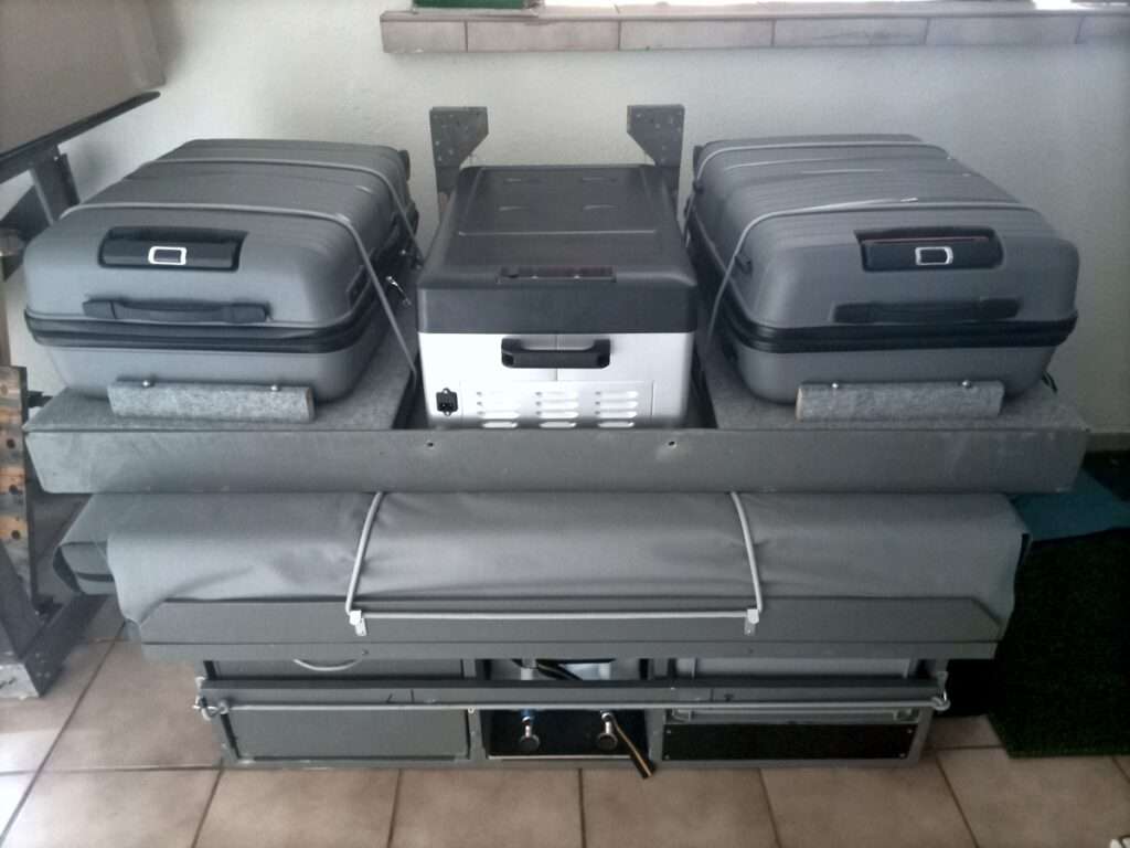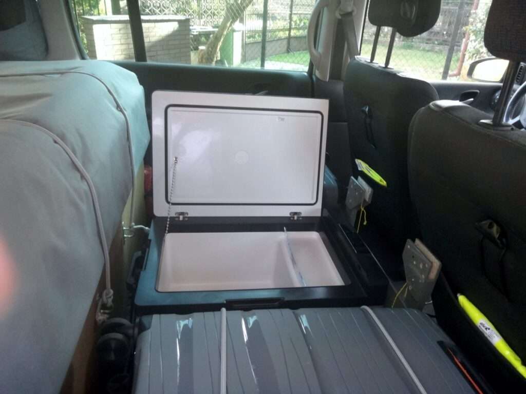 Zdjęcia pierwsze i drugie pokazują widok zabudowy podłogi po otwarciu prawych i lewych drzwi pasażera. W aucie zostawiłem tylko przednie fotele – to wersja przygotowana dla dwóch osób! W zabudowie mieszczą się dwie walizki, łatwe do otwarcia lub wyjęcia po odpięciu gum mocujących. Pomiędzy nimi znajduje się lodówka.