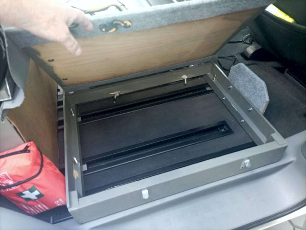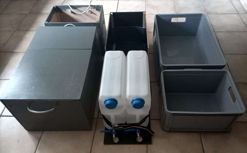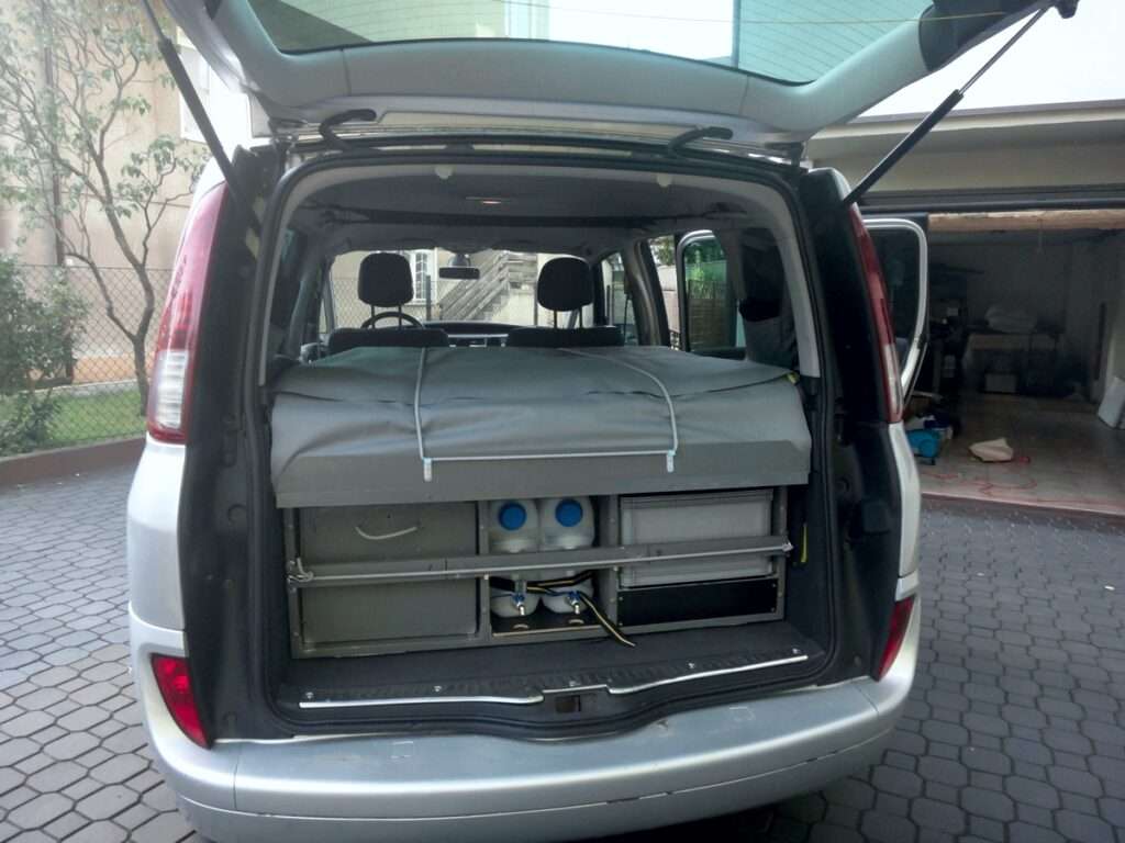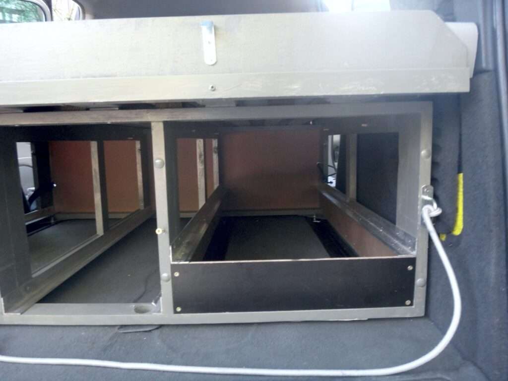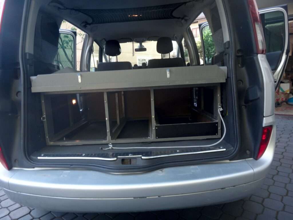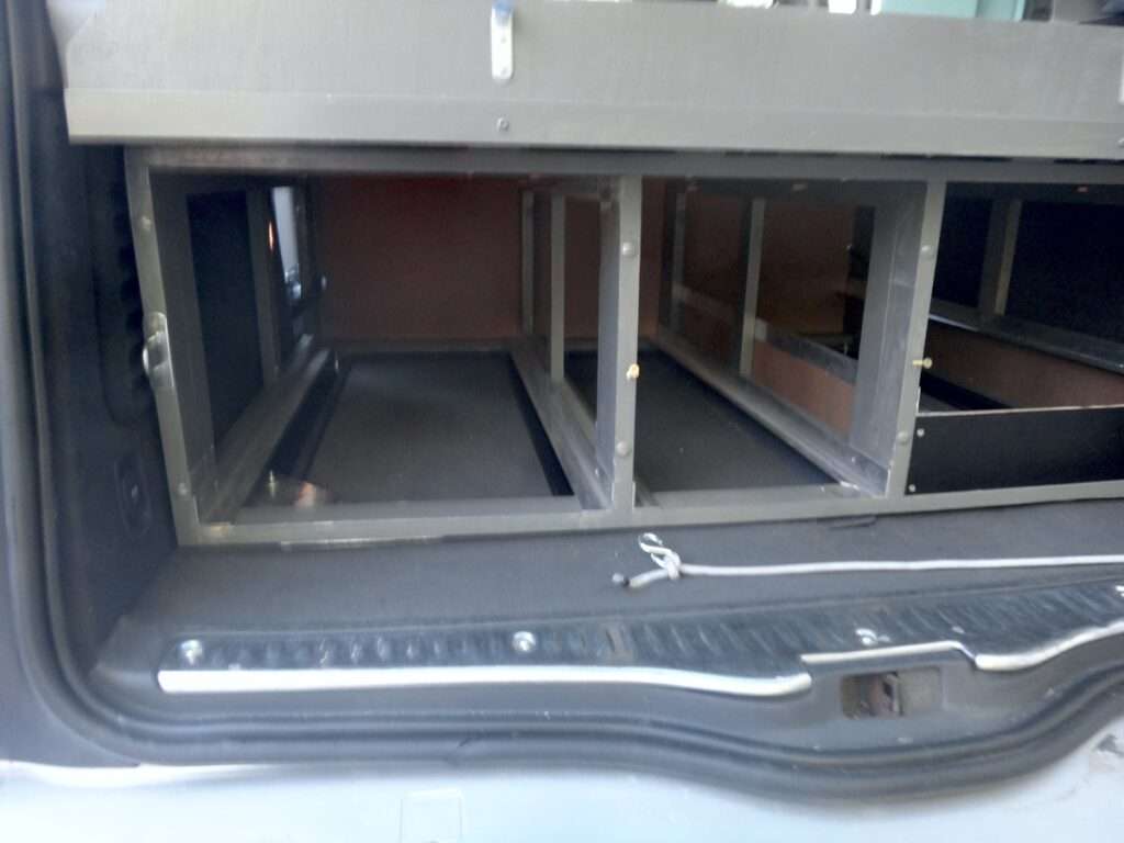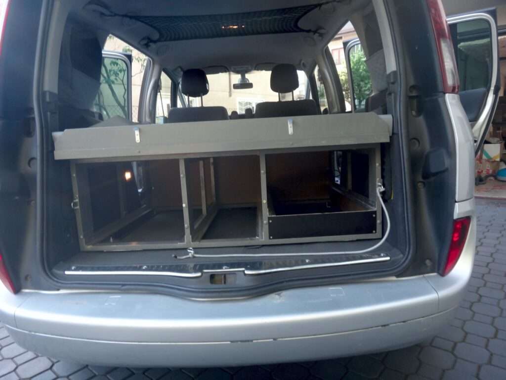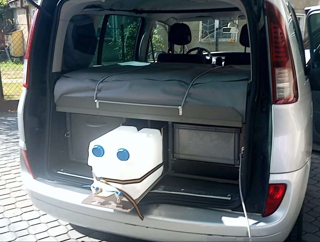 Pierwsze trzy zdjęcia pokazują kolejno: widok po otwarciu klapy bagażnika, po wyjęciu stolika oraz po wyjęciu krzesełek. Na czwartym widać wysuniętą szufladę ze zbiornikami na wodę (dwa po 10 litrów każdy). Przy okazji – nie stosowałem prowadnic do szuflad. Moim zdaniem są przereklamowane: drogie, ciężkie i zbyt skomplikowane. W zupełności wystarczają aluminiowe kątowniki.