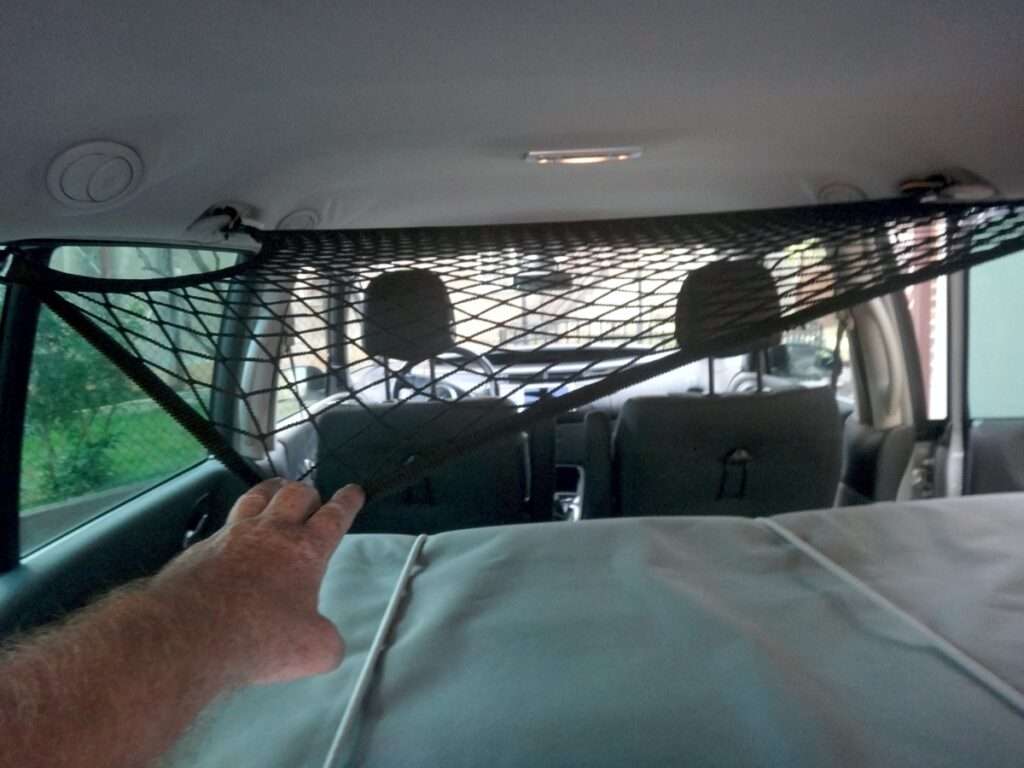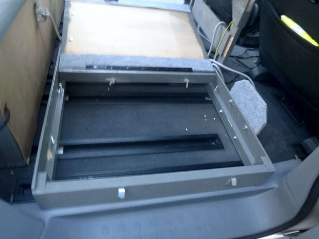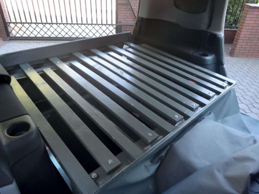 Na czwartym zdjęciu widać stelaż wkładany do samochodu (po wyjęciu tylnych foteli). Piąte pokazuje go już na swoim miejscu, a szóste – dwa z czterech punktów mocowania w rogach od wewnątrz stelaża. Siódme zdjęcie to widok na włożony stelaż od środka auta.
