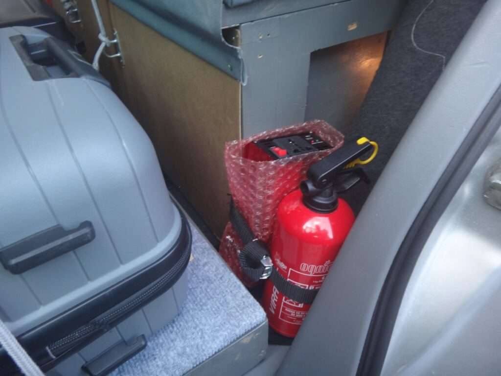 Na zdjęciu siódmym widać złożone łóżko widziane od środka auta, na ósmym – miejsce na apteczkę, a na dziewiątym – gaśnicę i przetwornicę. Dziesiąte zdjęcie przedstawia panel fotowoltaiczny, który doładowuje akumulator – cenny podczas korzystania z lodówki i innych urządzeń elektrycznych w czasie dłuższych postojów.