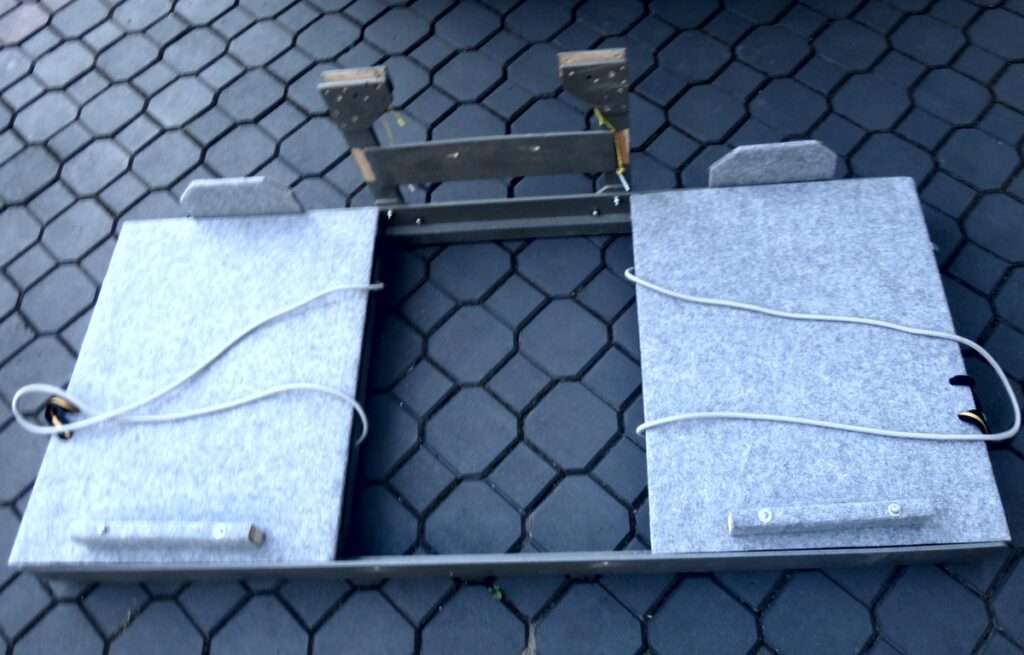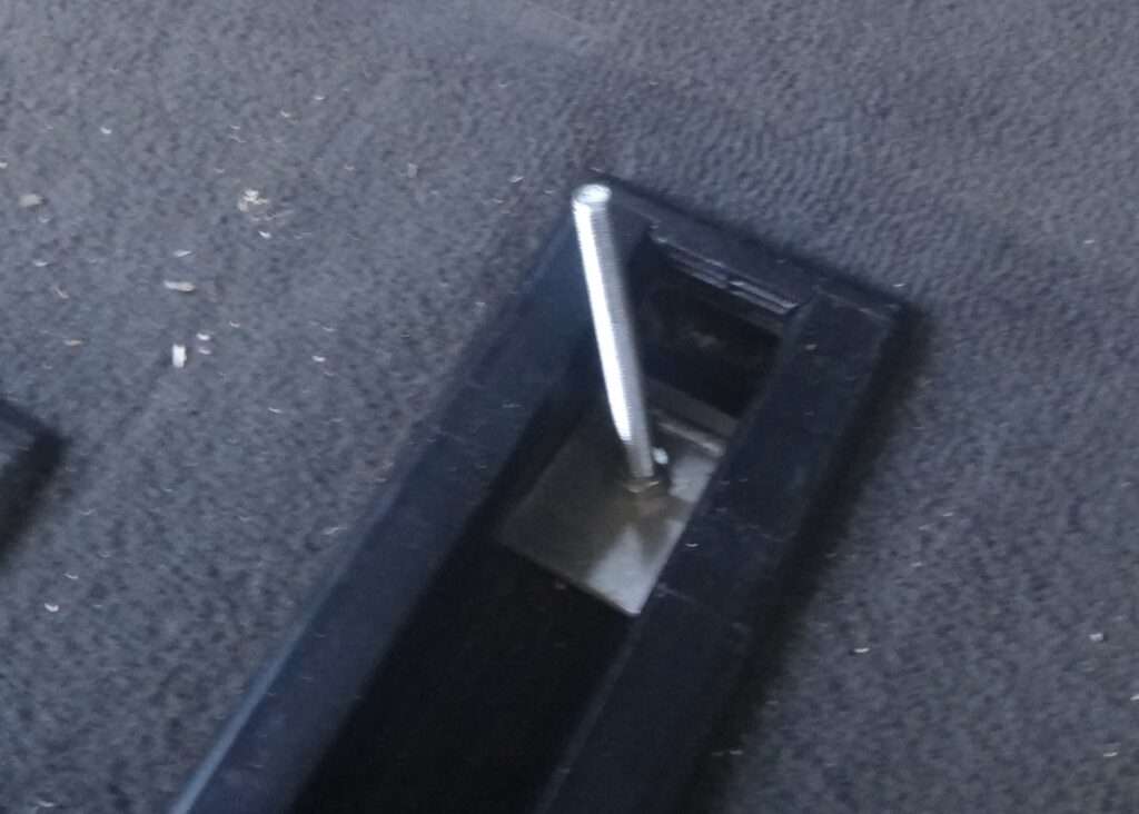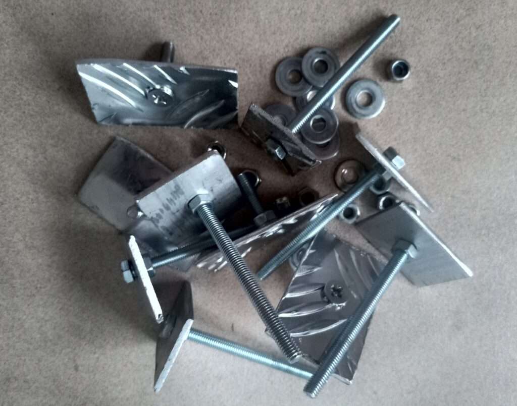 Pierwsze zdjęcie przedstawia całą zabudowę przechowywaną w garażu. Drugie pokazuje 10 śrub M6 z dorobionymi prostokątnymi „podkładkami” kotwiącymi z aluminiowej blachy ryflowanej, dopasowanymi do fabrycznych prowadnic foteli – zobacz zdjęcie trzecie.